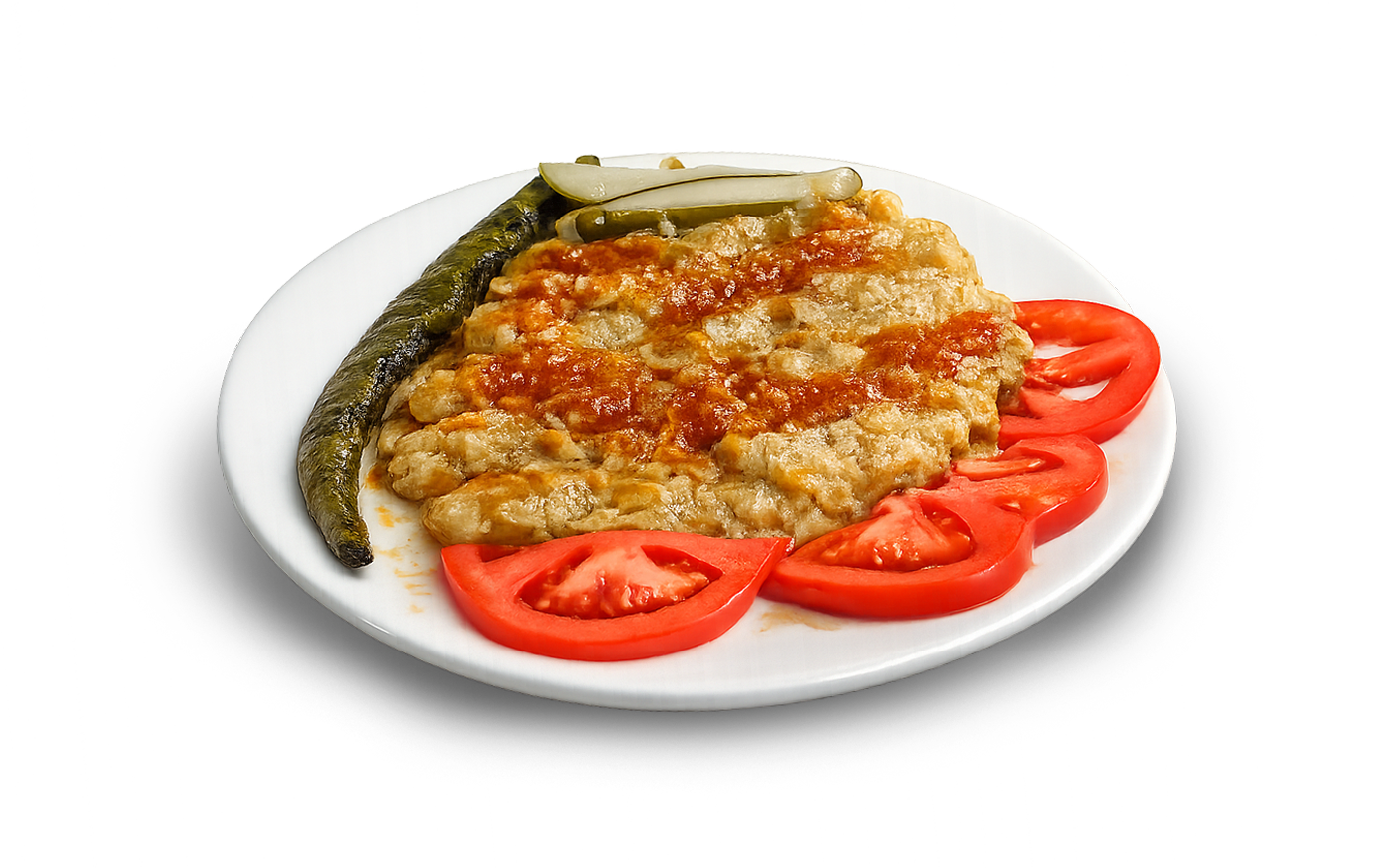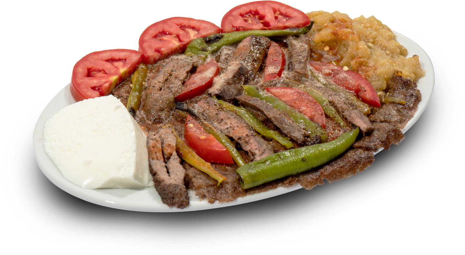Extra meat and steak, pita bread, tomato, tomato sauce, yogurt, butter, pepper