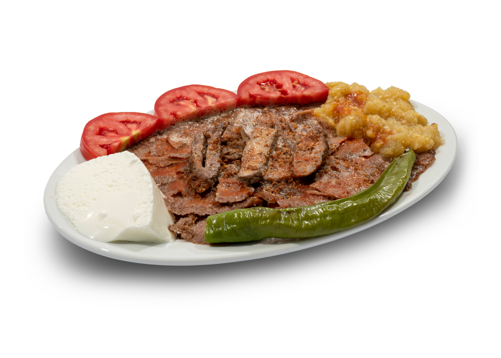 Meat and steak, pita bread, tomato, tomato sauce, yogurt, butter, pepper