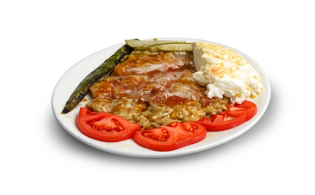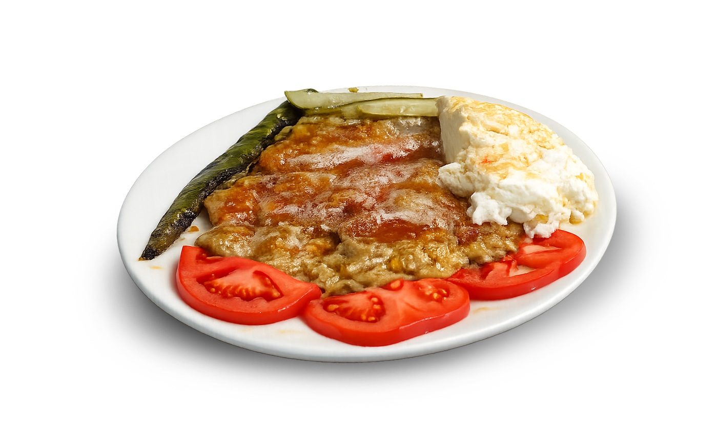 Pita bread, roasted eggplant, tomatoes, tomato sauce, peppers, pickles, yogurt, butter